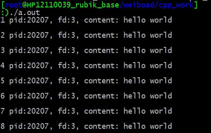 此程序中打开了文件并进行了读操作,之后在一个死循环中不断打印 pid 和 fd。被打开的文件为 data.txt, 其中只含有 “hello world” 这一行内容。运行此程序的输出如下: