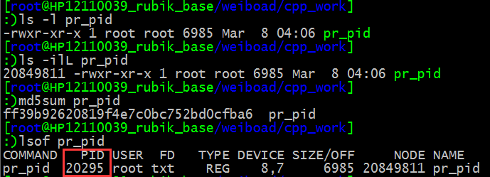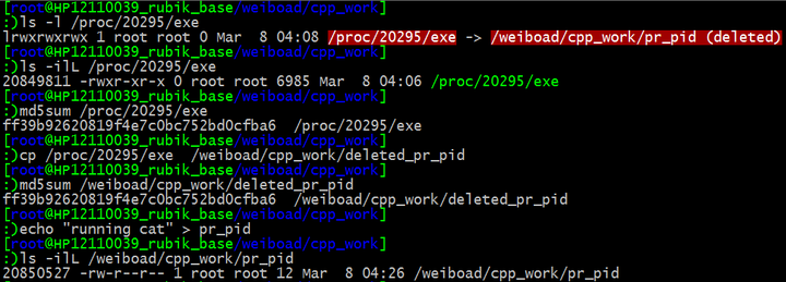 - 如果一个可执行文件正在运行,当我们把它删除后,删除的也只是文件名,操作系统依然保留了可执行文件的内容,这一点从 ls -ilL /proc/20295/exe 的结果中可以看出,其 i 节点号与删除前 pr_pid 文件的 i 节点号完全相同,执行md5sum /proc/20295/exe 的结果与之前 pr_pid 的md5 值也完全相同。
