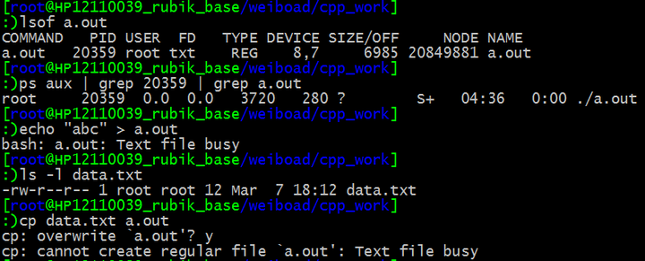 当我们试图向正在运行的可执行文件中写入内容时,会写入失败,系统提示 “Text file busy” 表示有进程正在执行这一文件。我们在上一篇中已经探讨过,当目标文件已经存在时,cp 命令会把原目标文件内容清空,之后写入新内容。因而这里用cp 命令覆盖可执行文件时,也要向 a.out 中写入新内容,系统同样会报错 ”Text file busy“。