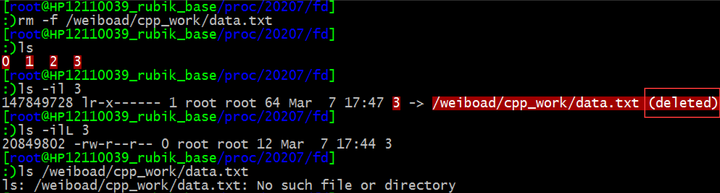 可以看出,删除后,fd 目录下的符号链接 3 显示指向的是一个被删除的文件。这时需要注意的是,ls -ilL 3 命令依然能执行成功,说明通过符号链接 3 依然能跟踪到目标文件,并且可以发现,通过 ls -ilL 3 命令得到的 i 节点号,和已经被删除的 data.txt 文件的 i 节点号完全一样,这说明虽然 data.txt 在相应目录中已经被删除,但是由于有其他进程打开这一文件后还未关闭,操作系统其实还为这些进程保留了磁盘上被打开的文件内容。
