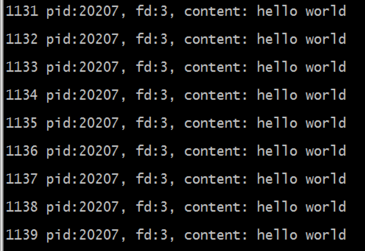 printf("%d pid:%d, fd:%d, content: %s\n", i, pid, fd, buffer);