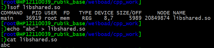 可以看出,操作系统是允许我们向使用中的动态库中写入内容的,并不会像写入可执行文件一样报告“Text file busy”,因而在写入方面,操作系统只对可执行文件进行了保护。