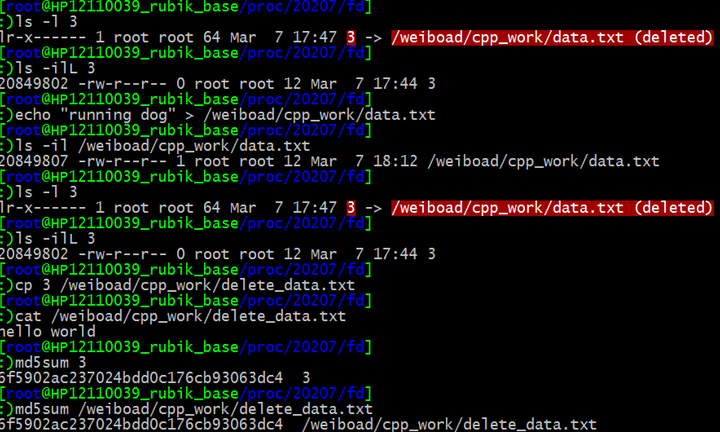 当用 cp 命令不加任何选项复制一个符号链接时,复制的是符号链接指向的目标文件,md5sum 也是自动跟踪链接的目标文件。从这两个命令的输出可以看出,文件描述符 3 指向的内容就是被删除文件的内容,这一内容是可以通过 cp 命令复原的(delete_data.txt 文件)。md5sum delete_data.txt 的结果也与被删除的 data.txt 的md5 值相同,这进一步说明了原 data.txt 的内容没有被删除。