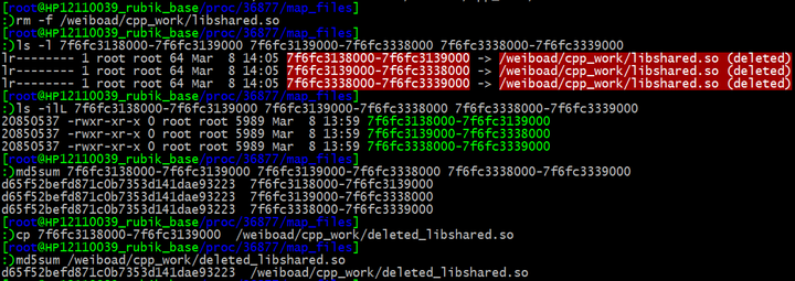 从中可以看出,/proc 中的三个链接都是指向了相同的 libshared.so 库文件,并且三个链接和 libshared.so 的md5 值全部相同(因为md5sum 会跟踪符号链接)。