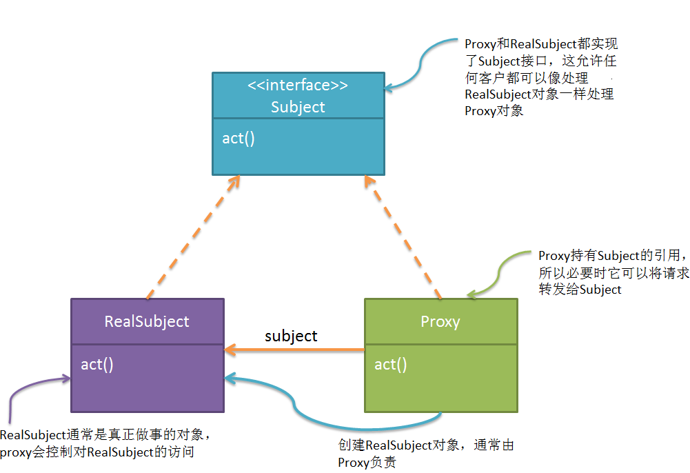 首先是Subject,它为RealSubject和Proxy提供了接口,通过实现同一接口,Proxy在RealSubject出现的地方取代它。