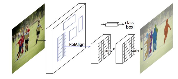 Mask RCNN 通过改进 Faster RCNN 可以实现 7 FPS 的 instance segmentation 和关键点检测,并且超过当时的所有方法。Mask RCNN 在 COCO 和 CITYSCAPES 数据集上面取得了好的结果。Mask RCNN 的示意图如下。