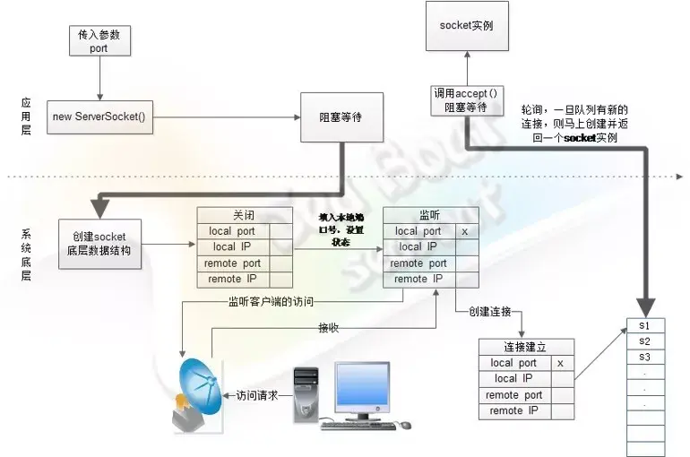 当应用层new ServerSocket 阻塞等待,操作系统会做一系列操作并监听客户端的访问。而当服务端接收到客户端连接时,就会创建一个socket数据结构并放到队列中,随后应用层的accept就会轮询获取客户端socket。