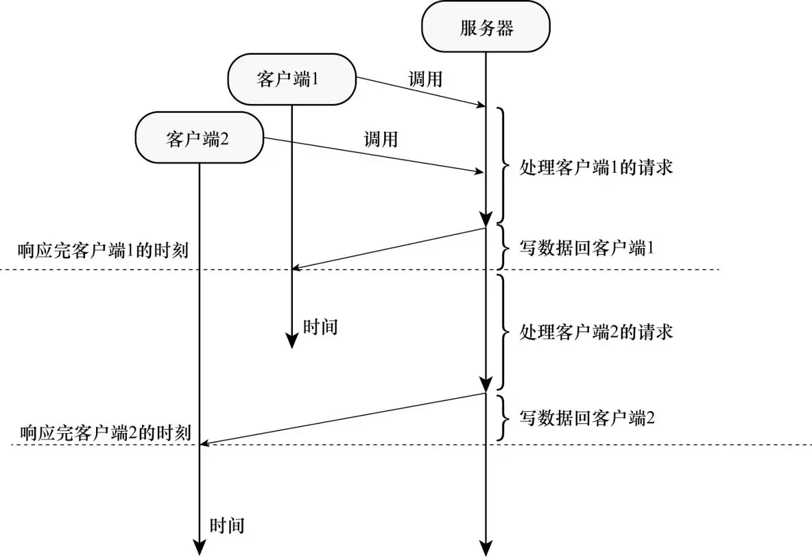 从单线程阻塞模式来看,共有两个客户端请求服务器,其中第二个客户端必须等到第一个客户端处理完成后才能开始处理。