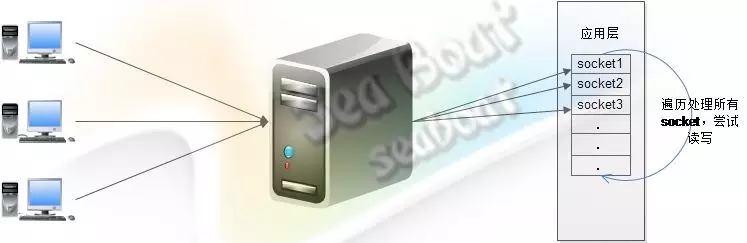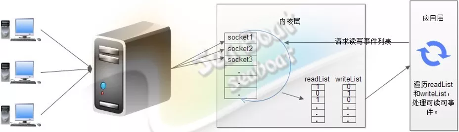 在单线程非阻塞模式中,服务器一个线程维护着多个客户端的请求,该线程不断遍历处理所有socket,尝试读写。基于事件监测模式,服务器会告诉操作系统需要关注的事件,接着操作系统负责检测所有客户端的连接并将检测到的事件放进两个列表中,最后,应用层只需要遍历这两个列表即可开始处理。