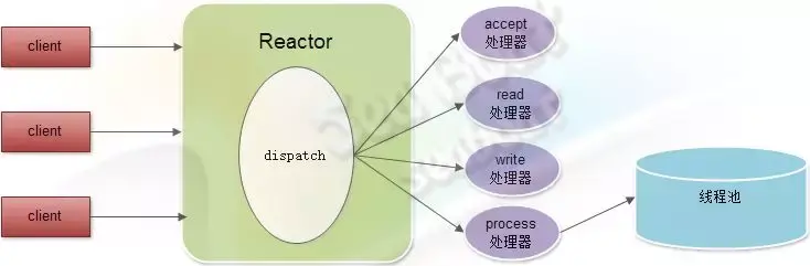 实际项目中,我们较常用的模式是Reactor模式。Reactor线程负责将客户端连接的不同事件分配到不同的处理器中进行处理,如accept处理器、read处理器、write 处理器和process处理器。