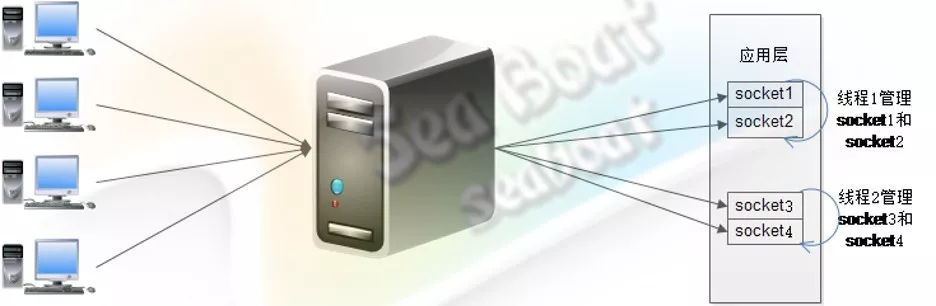 在多线程非阻塞模式中,服务器有多个线程共同负责多个客户端,客户端的连接会均匀分配给每个线程管理。