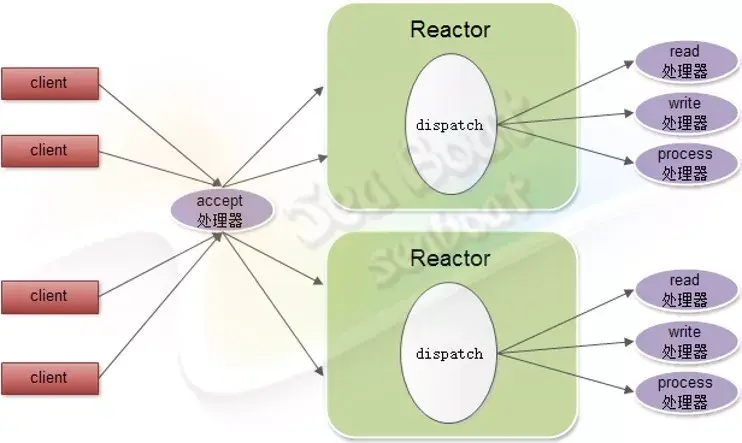 除此之外,还有一种改良的Reactor模式,即如果一个Reactor不够用,那么就创建多几个Reactor来同时处理。如下图,这里有两个Reactor对象,每个对象都有read处理器、write处理器和process处理器。而客户端连接的分发工作则共同由一个accept处理器完成,再均匀分配到不同的Reactor对象中。