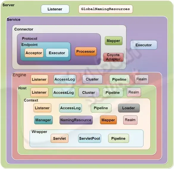 Container包含了四个级别,分别为Engine、Host、Context和Wrapper,其中Engine是全局的Servlet引擎,Host是虚拟主机,Context对应web应用,Wrapper则对应web应用中的servlet对象。