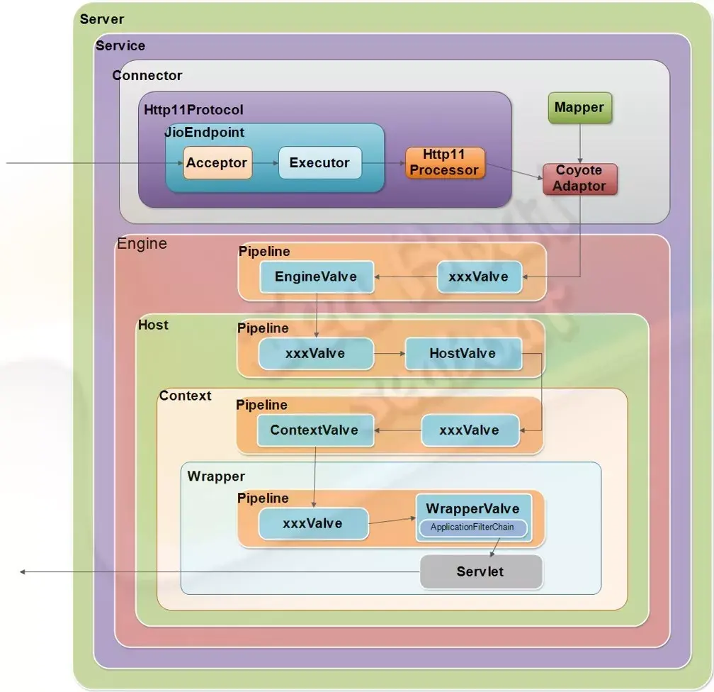 一个完整的请求处理过程是怎样的呢?如图,Connector启动后会由JioEngdpoint 来负责接受客户端的请求连接,并在接收后交由任务池进行处理。该任务池会根据Http11Processor的逻辑(按照HTTP1.1协议)来对请求报文进行解析处理。接着,CoyoteAdapter适配器会适配到对应的servlet来进行业务逻辑处理。这一过程会经历四个管道,每个管道可能有若干个阀门,处理后最后将到达Wrapper容器的servlet来处理,并将响应报文返回到客户端,完成整个请求过程。