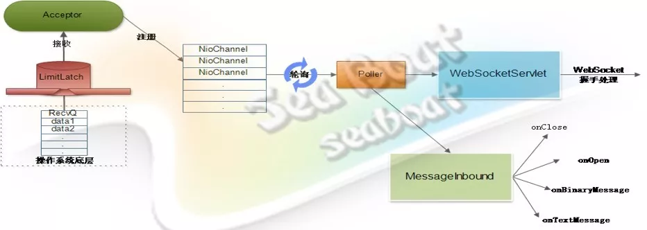 当WebSocket的客户端连接被接收器接收并注册到NioChannel队列后,Poller组件不断轮询是否有需要处理的NioChannel。如果 有,则经过处理管道后进入到继承了WebSocketServelt的Servelt上。WebSocketServlet的doGet方法会处理WebSocket握手,告知客户端同意升级协议。随后Poller继续轮询相关NioChannel,一旦发现使用WebSocket协议的管道,则会调用MessageInbound的相关方法,完成不同事件的处理,从而实现对WebSocket协议的支持。
