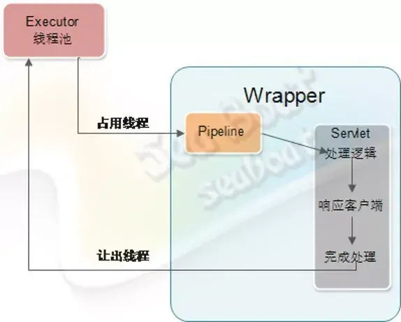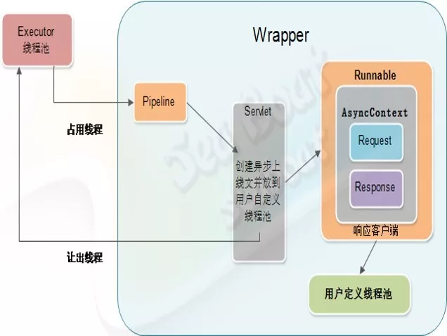 同样,当客户端请求到来时,首先通过管道,然后进入到Wrapper容器的管道,再调用Servlet实例的service后,创建一个异步Servlet将耗时的逻辑操作封装起来,交给用户自己定义的线程池。这样就可以避免因Servlet中的处理逻辑耗时长而影响Tomcat的整体处理能力。