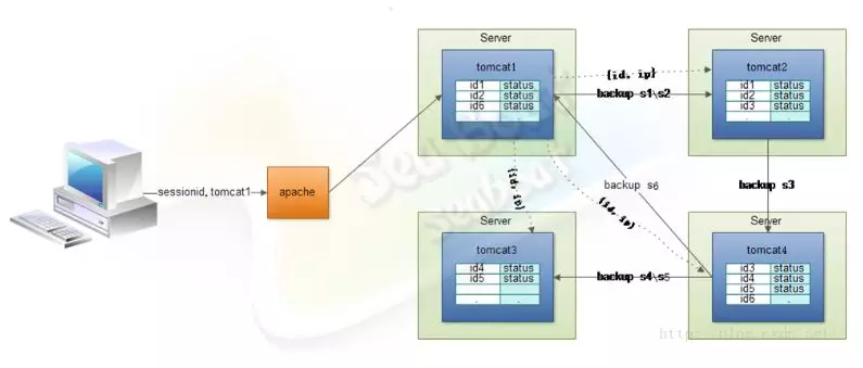 一个请求经由Apache分发到Tomcat集群中某个节点,再生成会话信息。这些会话信息可以通过一定的备份机制,只将信息都同步在某一个节点上,而不是同步到所有节点,这样大大减少了网络开销,能有效避免网络阻塞。
