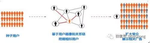 我们再来看一个策略,依然是腾讯的,腾讯社交广告一直对外宣称的技术“Lookalike”,翻译成技术语言就是“人群扩散算法”。简单的逻辑是,先找种子用户,然后基于用户画像和关系链(这是腾讯强项)挖掘相似用户,然后再将受众进行扩大。