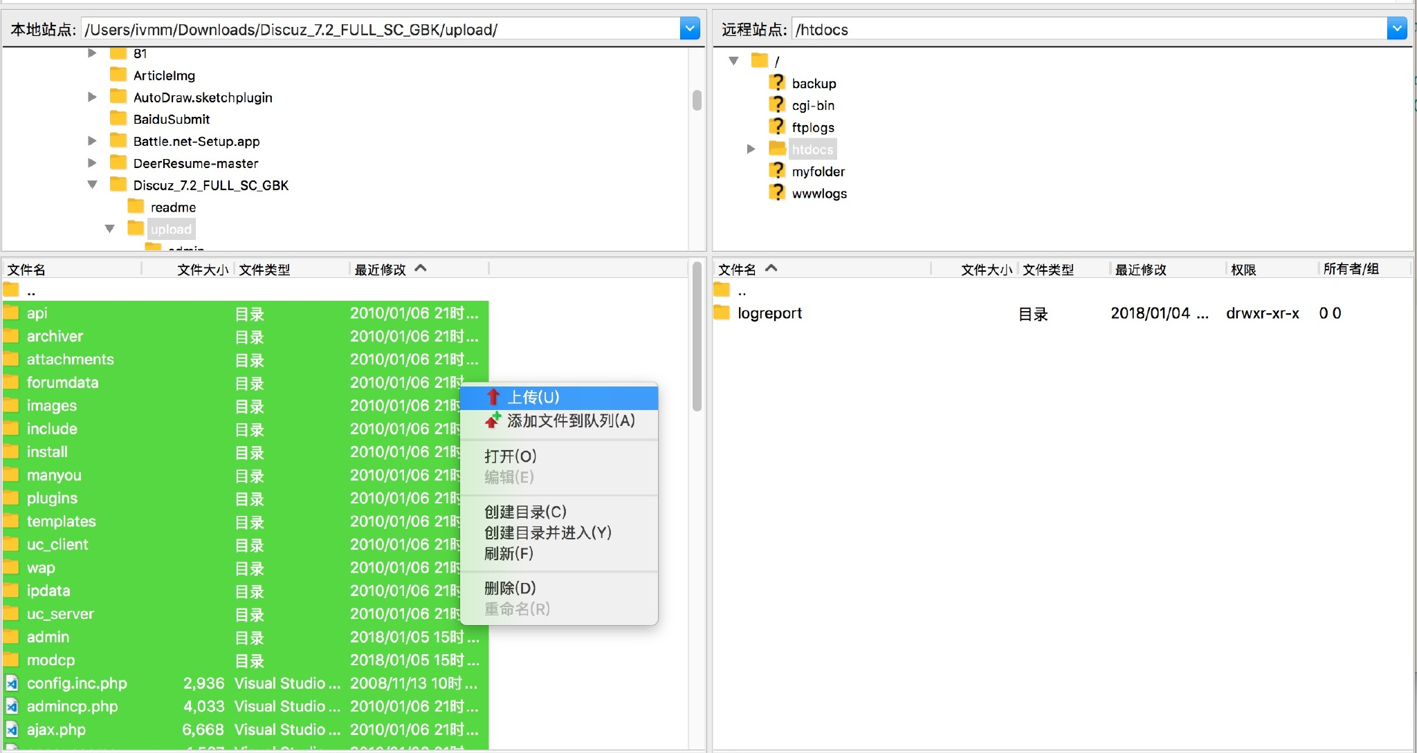 将 DZ 解压后的 upload 目录上传到虚拟主机的 htdocs 目录下: