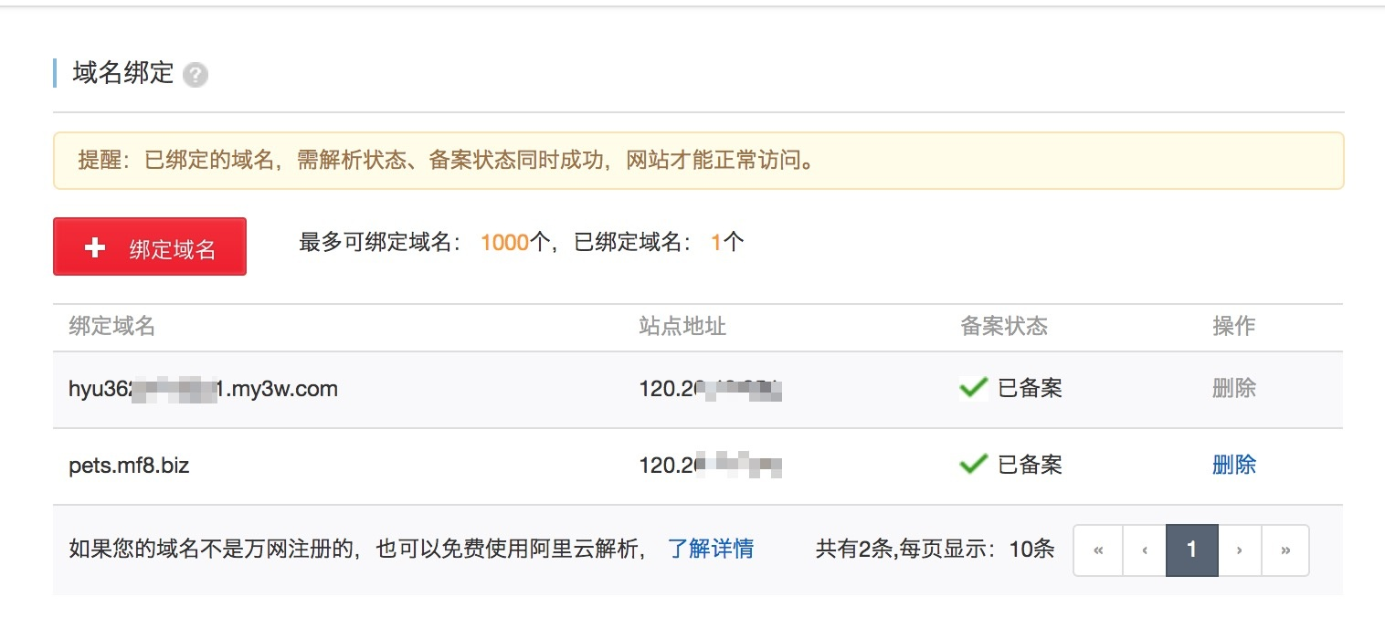 重新回到主机管理平台,在 站点信息 —— 域名管理 —— 域名绑定 下添加域名。