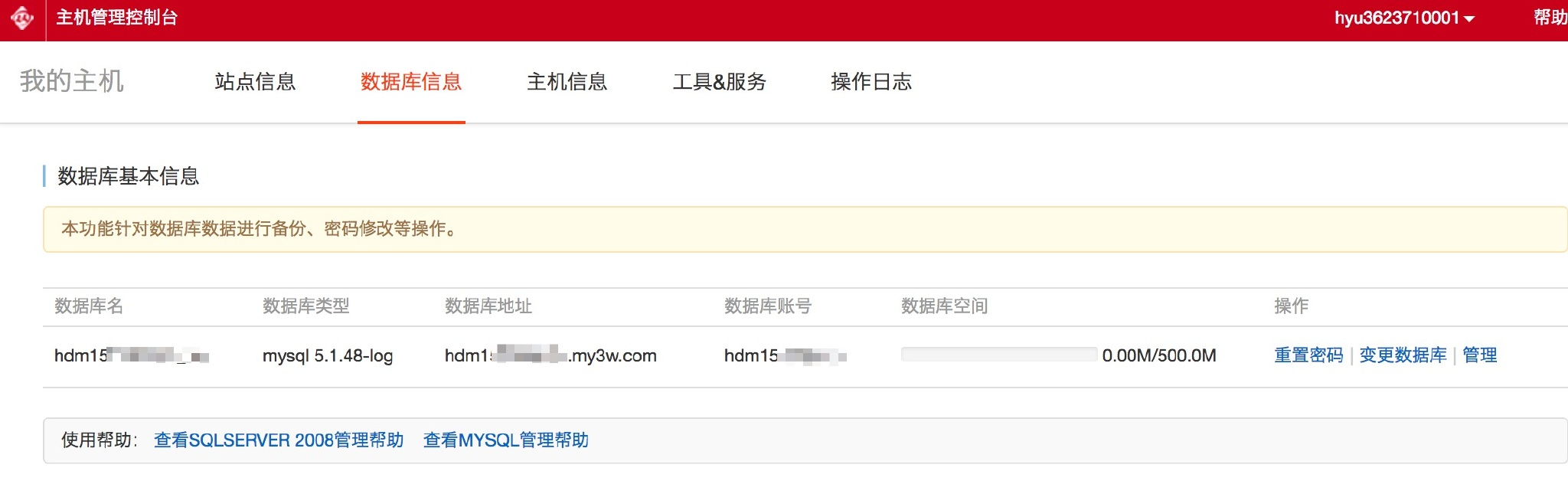 进入主机控制台 —— 数据库信息,查看数据库信息: