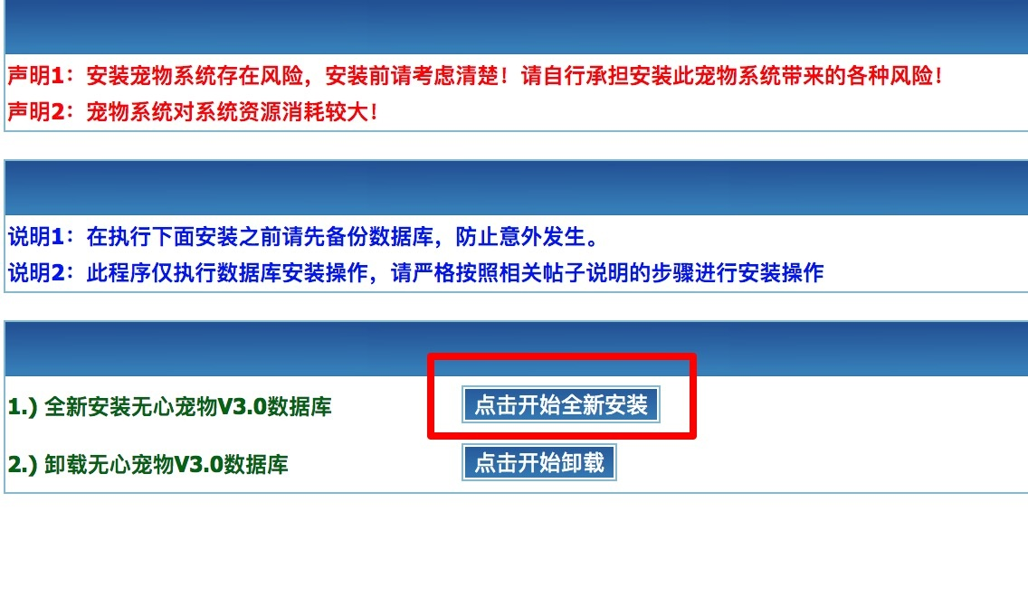 打开 http://虚拟主机地址/pet_install.php,点击 点击开始全新安装