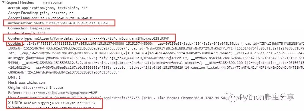 authorization(感觉应该是js生成的,后面再看Content-Type(后面多了boundary=xxx 这种,那这种是啥意思呢,后面和请求参数一起看cookie:这个要注意,登陆前cookie就不为空,说明之前肯定有set-cookie的操作x-udid,x-sxrftoken这两个都是验证参数,估计都在网页源代码能找到