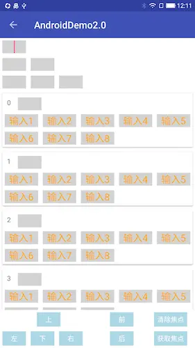 写了个测试用的demo,上面很多EditText啦,还有上下左右前后等焦点的控制键。