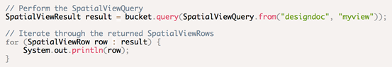 上图中构建view的脚本中对bucket中数据进行了筛选,之后用户便可以通过查询view获取筛选后的信息。下图是对普通view和空间view(支持基于地理坐标的查询,常用于支持定位功能的应用)的查询范例:
