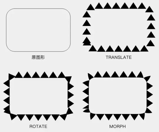它的构造方法 PathDashPathEffect(Path shape, float advance, float phase, PathDashPathEffect.Style style) 中, shape 参数是用来绘制的 Path ; advance 是两个相邻的 shape 段之间的间隔,不过注意,这个间隔是两个 shape 段的起点的间隔,而不是前一个的终点和后一个的起点的距离; phase 和 DashPathEffect 中一样,是虚线的偏移;最后一个参数 style,是用来指定拐弯改变的时候 shape 的转换方式。style 的类型为 PathDashPathEffect.Style ,是一个 enum ,具体有三个值: TRANSLATE:位移 ROTATE:旋转 MORPH:变体