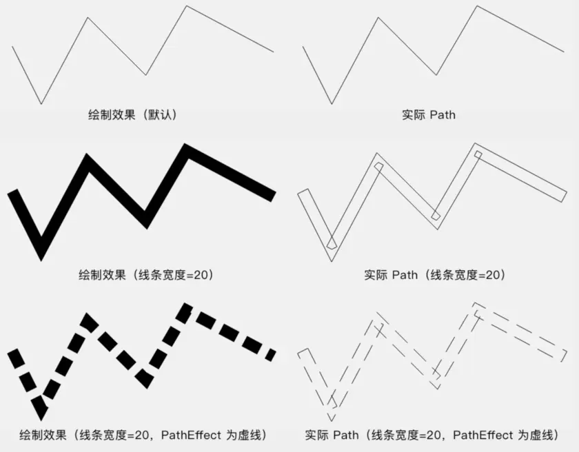 默认情况下(线条宽度为 0、没有 PathEffect),原 Path 和实际 Path 是一样的;而在线条宽度不为 0 (并且模式为 STROKE 模式或 FLL_AND_STROKE ),或者设置了 PathEffect 的时候,实际 Path 就和原 Path 不一样了: