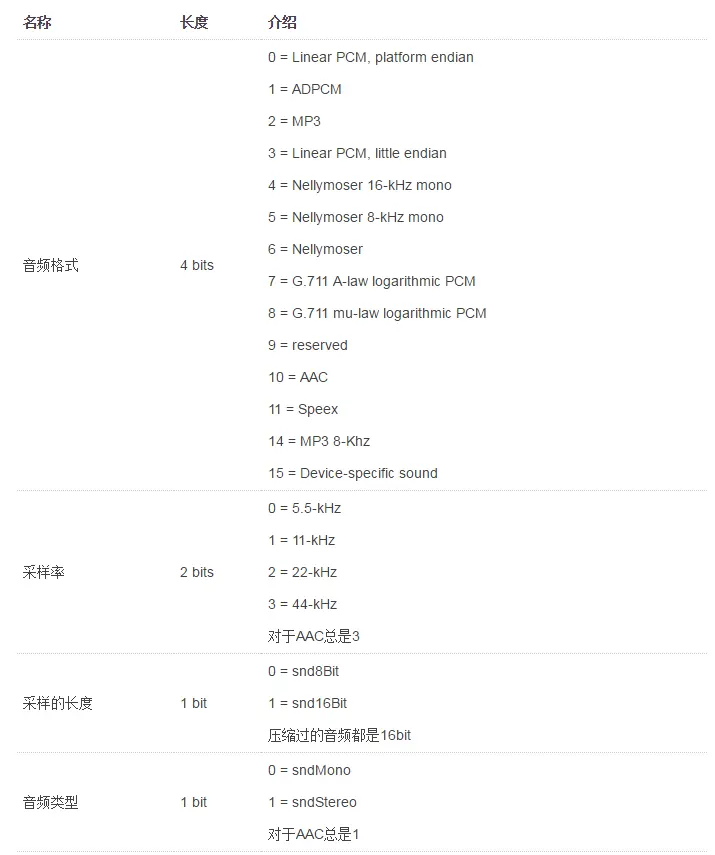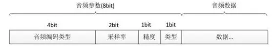 第1个字节的前4位的数值表示了音频编码类型,第5-6位的数值表示音频采样率,第7位表示音频采样精度,第8位表示音频类型。具体格式如下: