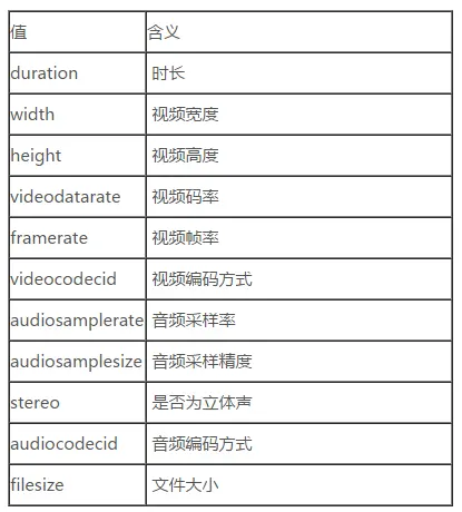 FLV文件中,第一个字节一般总是0x02,表示字符串。第2-3个字节为UI16类型值,标识字符串的长度,一般总是0x000A(“onMetaData”长度)。后面字节为具体的字符串,一般总为“onMetaData”(6F,6E,4D,65,74,61,44,61,74,61)。