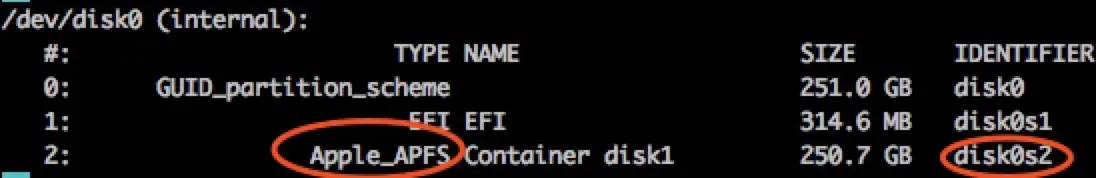找到 TYPE NAME 内 Apple_APFS 打头的盘符,记下图中第二个圈圈里的内容: