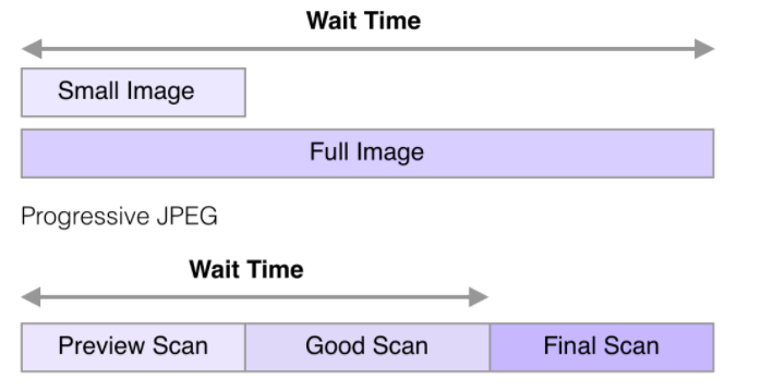 PJPEG在加载时提供图像的低分辨率“预览”的能力提高了感知性能 - 与自适应图像相比,用户可以感觉到图像加载更快。在较慢的3G连接上,这允许用户只在接收到文件的一部分时(粗略地)看到图像中的内容,这可以比基线JPEG提供的图像的从上到下的显示更令人愉快.