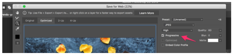 大多数优化工具将允许您设置您满意的压缩级别;较高的压缩率会减小文件大小,但会引入伪影,光晕或块状降级。