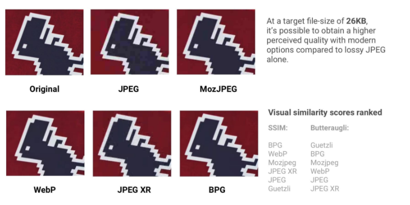 不同的现代图像格式(和优化器)用于演示目标文件大小为26KB的可能性。我们可以使用SSIM(结构相似性)或Butteraugli来比较质量,我们将在后面详细介绍。