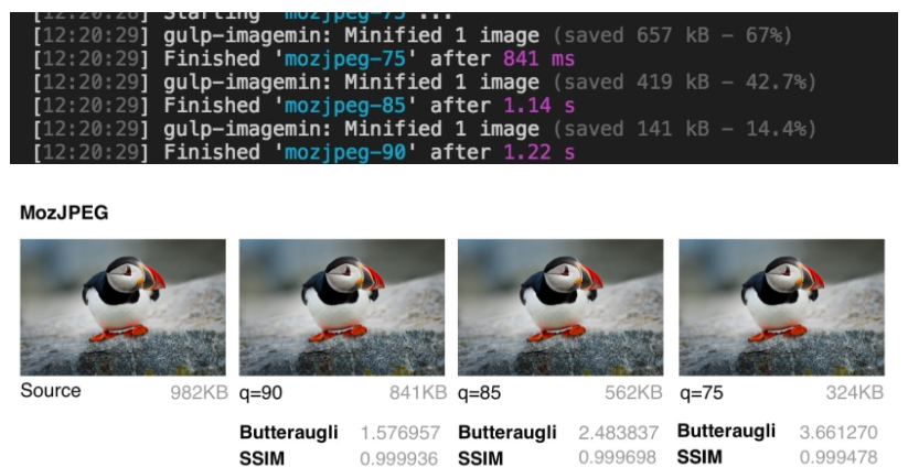 在ImageOptim中都支持MozJPEG,并且有一个相对可靠的可配置imagemin插件。下面是一个使用Gulp的示例实现: