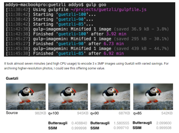 Guetzli声称与其他压缩机相比,给定Butteraugli分数的图像数据大小减少了20-30%。使用Guetzli的一个很大的警告是,它是非常,非常缓慢,目前只适用于静态内容。从README中,我们可以注意到Guetzli需要大量的内存 - 它可能需要1分钟+每百万像素200MB RAM.当您将图像作为静态网站的构建过程的一部分进行优化时,它可能是理想选择,但在按需执行时则不太适合。