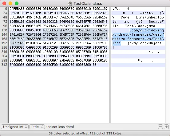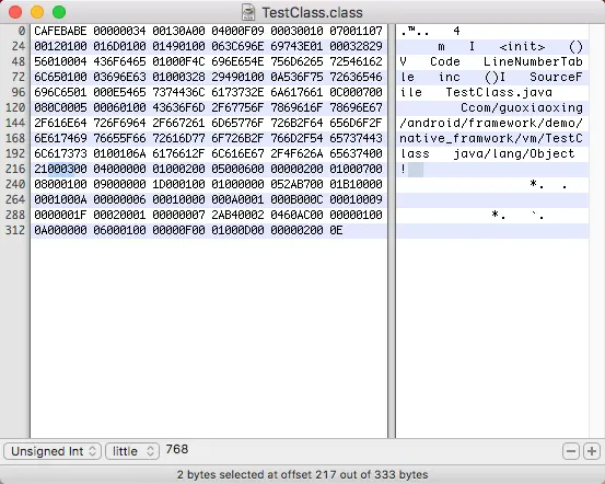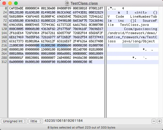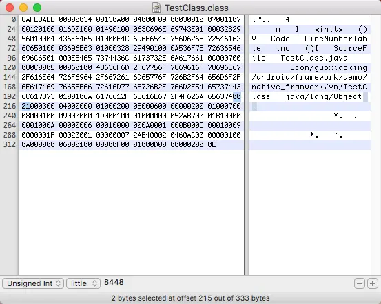 编译生成Class文件,然后使用hexdump命令查看Class文件里的内容。