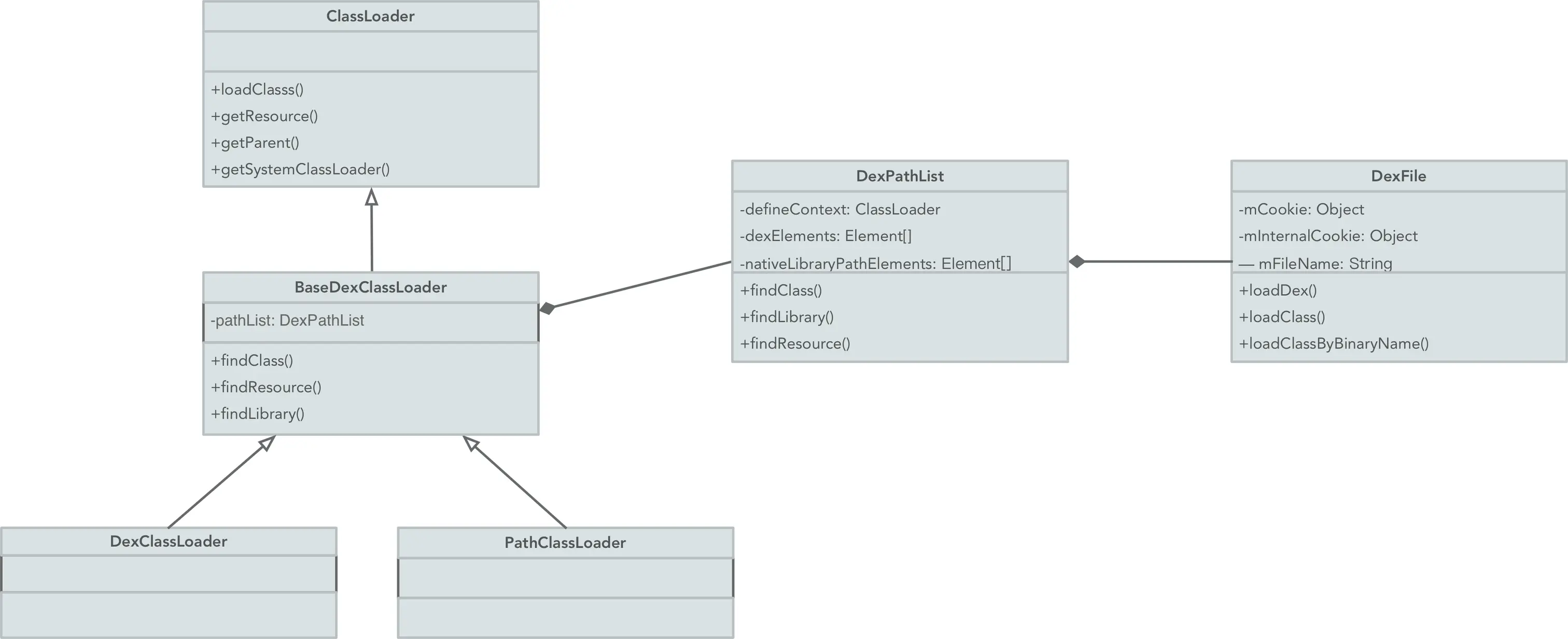 Android虚拟机有两个类加载器DexClassLoader与PathClassLoader,它们都继承于BaseDexClassLoader,它们内部都维护了一个DexPathList的对象,DexPathList主要用来存放指明包含dex文件、native库和优化odex目录。 Dex文件采用DexFile这个类来描述,Dex的加载以及类的查找都是通过DexFile调用它的native方法来完成的。