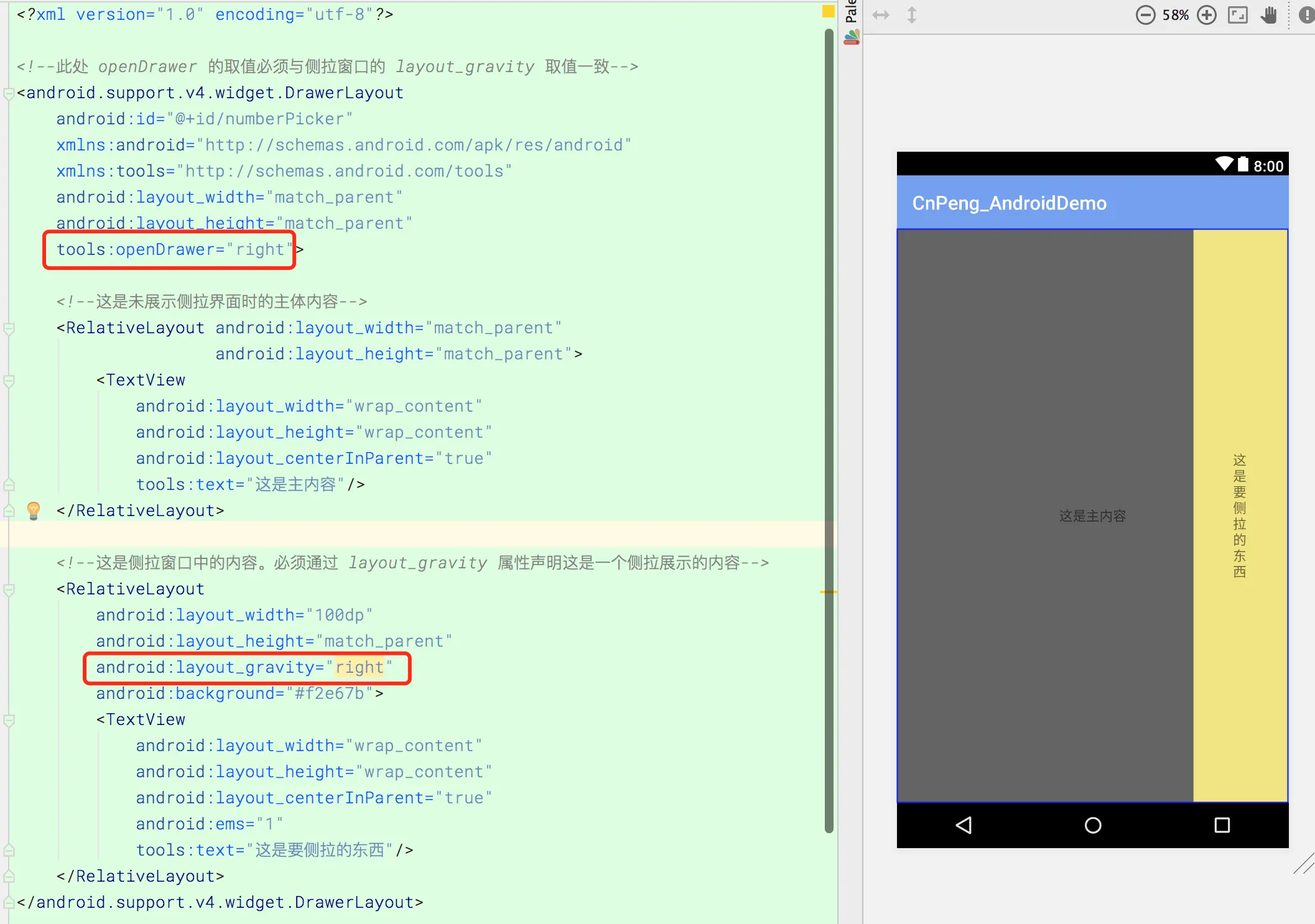 1、在 <DrawerLayout > 需要通过 layout_gravity 声明哪一部分作为侧拉窗口,其取值也是 end、start、left、right。