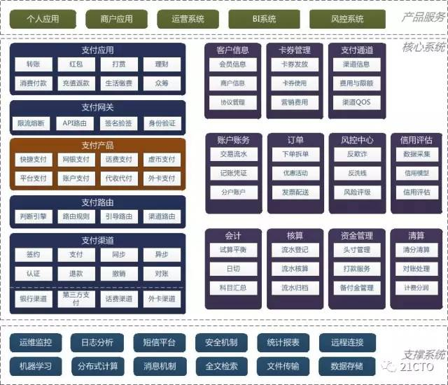 支撑系统、核心系统和服务系统,在每个互联网公司的架构上都是大同小异的,都是必不可少的模块。而支付应用是每个公司根据自己的业务来构建的,各不相同。