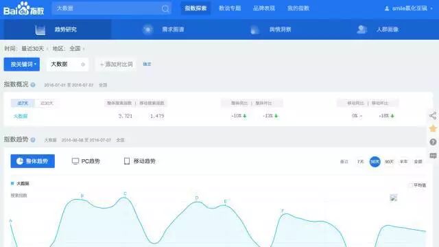 大家都很熟悉的指数查询平台,可以根据指数的变化查看某个主题在各个时间段受关注的情况,进行趋势分析、舆情预测有很好的指导作用。除了关注趋势之外,还有需求分析、人群画像等精准分析的工具,对于市场调研来说具有很好的参考意义。同样的另外两个搜索引擎搜狗、360也有类似的产品,都可以作为参考。