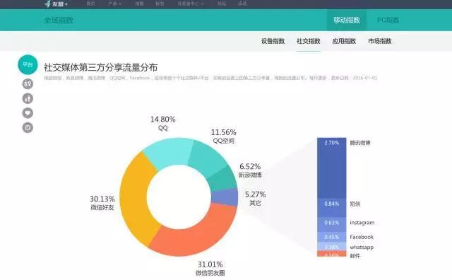 友盟在移动互联网应用数据统计和分析具有较为全面的统计和分析,对于研究移动端产品、做市场调研、用户行为分析很有帮助。除了友盟指数,友盟的互联网报告同样是了解互联网趋势的优秀读物。