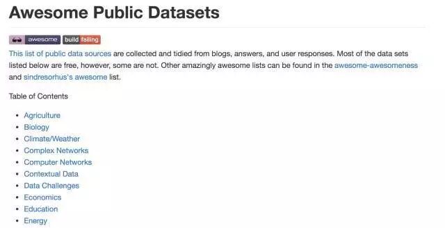 如果觉得前面的数据源还不够,github上的大神已经为大家整理好了一个非常全面的数据获取渠道,包含各个细分领域的数据库资源,自然科学和社会科学的覆盖都很全面,简直是做研究和数据分析的利器。