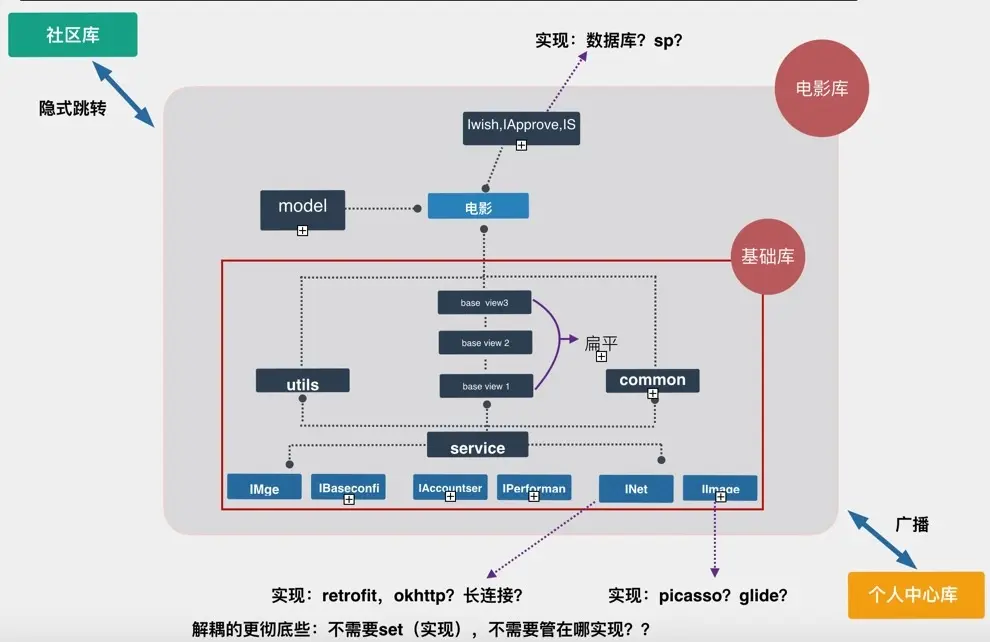 电影详情页是建立在一层层的基类之上,这些基类耦合了具体的网络加载等各种服务。因为详情页有想看、评分、点赞等可编辑状态,所以还耦合了greendao数据库(以前网络加载也耦合了这个数据库,后来换成了retrofit+rxjava,所以替换到了这层耦合,谢天谢地)。该页面因为需要和其他页面互动(比如跳转、评分同步等),所以也同时耦合了其他页面的类。除此之外,还有utils,view,model等。如果想把电影详情页抽离出来,这些所有的耦合都要剥离。具体需要解决的问题,如下: