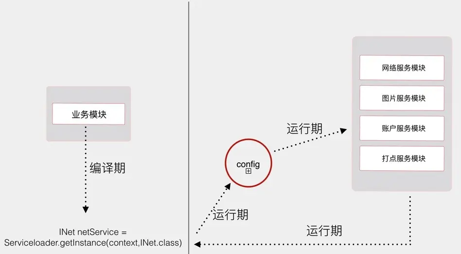 我们知道每个app都会提供账户信息,设备信息,网络服务,图片加载服务,打点服务,下拉刷新样式,错误状态等。每一个app的这些服务可能都不一样,比如美团使用的网络服务是okhttp,而点评使用的是长连接。所以我们的业务逻辑lib不能耦合这些具体的服务。只能耦合服务抽象而来的接口。在具体app使用的时候,我们再把app的服务提供给这个lib。那么这些服务怎么给呢?如果当需要服务时,我都留了一个传参的口子,这样我就需要把app的服务一个个塞到lib中需要的地方。这样成本太大了。我不希望这么麻烦,我希望的方式是直接把服务实现作为txt文本放在app的某个文件夹,你这个lib就能给我运行。这样我几乎不用管lib里面是什么东西。你只要给我一个业务lib,我添加一个txt文本,就能运行了。