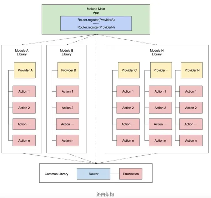 那么这个路由框架是怎么工作的呢?这里的action是一个服务,provider是一个map集合,盛放一个lib里的所有(action名字:action实例)键值对。在宿主app中注册各个lib的provider。这样module A请求moduleB的服务时,通过(代码来源):