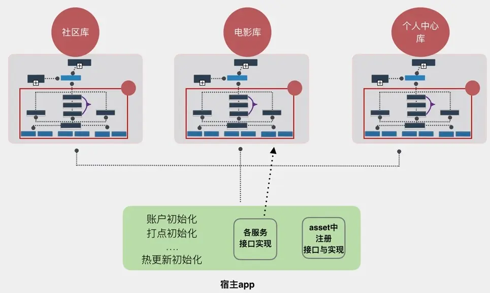 这样的话,lib中账户等数据就和宿主app的数据保持一致了。我们使用服务接口包一层,这样使用方式和之前的服务使用方式就一致了。 大体的示意图如: